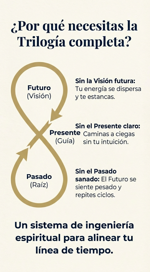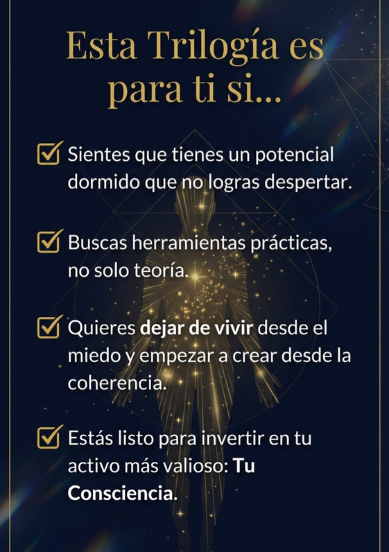 A través de audios de meditaciones guiadas y cuadernos de integración, esta trilogía te ofrece un sistema práctico y estructurado para alinear tu historia álmica, tu subconsciente y tu potencial futuro en una sola dirección de propósito.