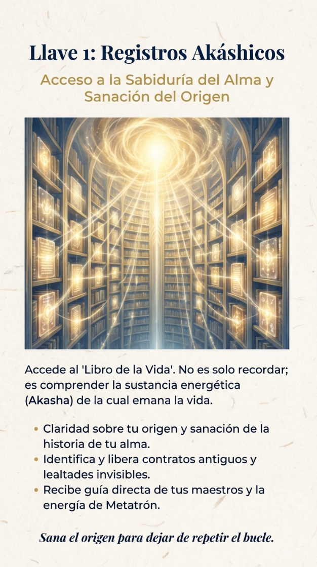 Registros Akáshicos (Pasado): Acceso a la sabiduría del alma para sanar patrones, contratos antiguos y memorias que bloquean tu expansión en el presente.