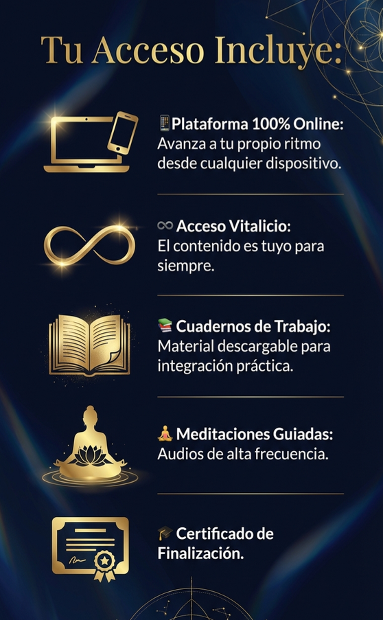 Este programa integra tres herramientas fundamentales —Registros Akáshicos, El Lenguaje de los Sueños y Tu Yo Futuro— para armonizar tu energía y revelar tu propósito desde un espacio de consciencia profunda. A diferencia de cursos aislados, esta trilogía ofrece un sistema de navegación integral para alinear tu historia álmica con tu realidad presente y tus potenciales futuros.